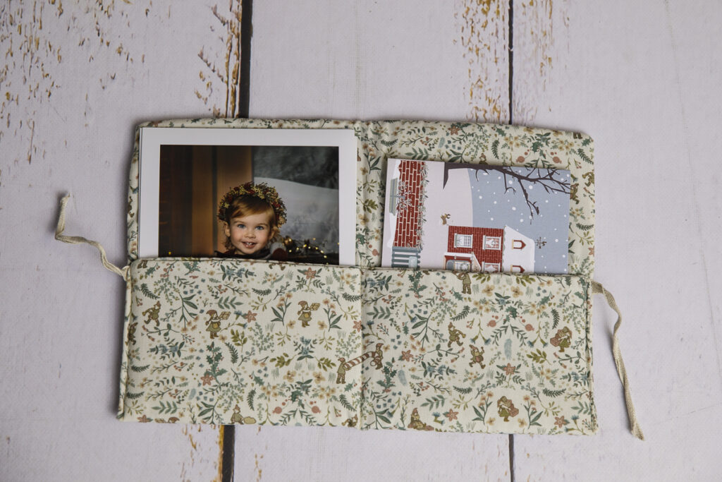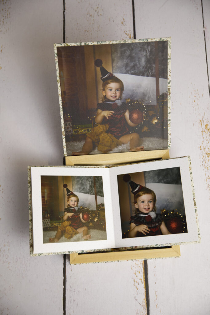 - Libreto de tela, con 3 felicitaciones de Navidad + 8 fotos tamaño 15×20 a elegir entre tus fotos seleccionadas: 40 €.