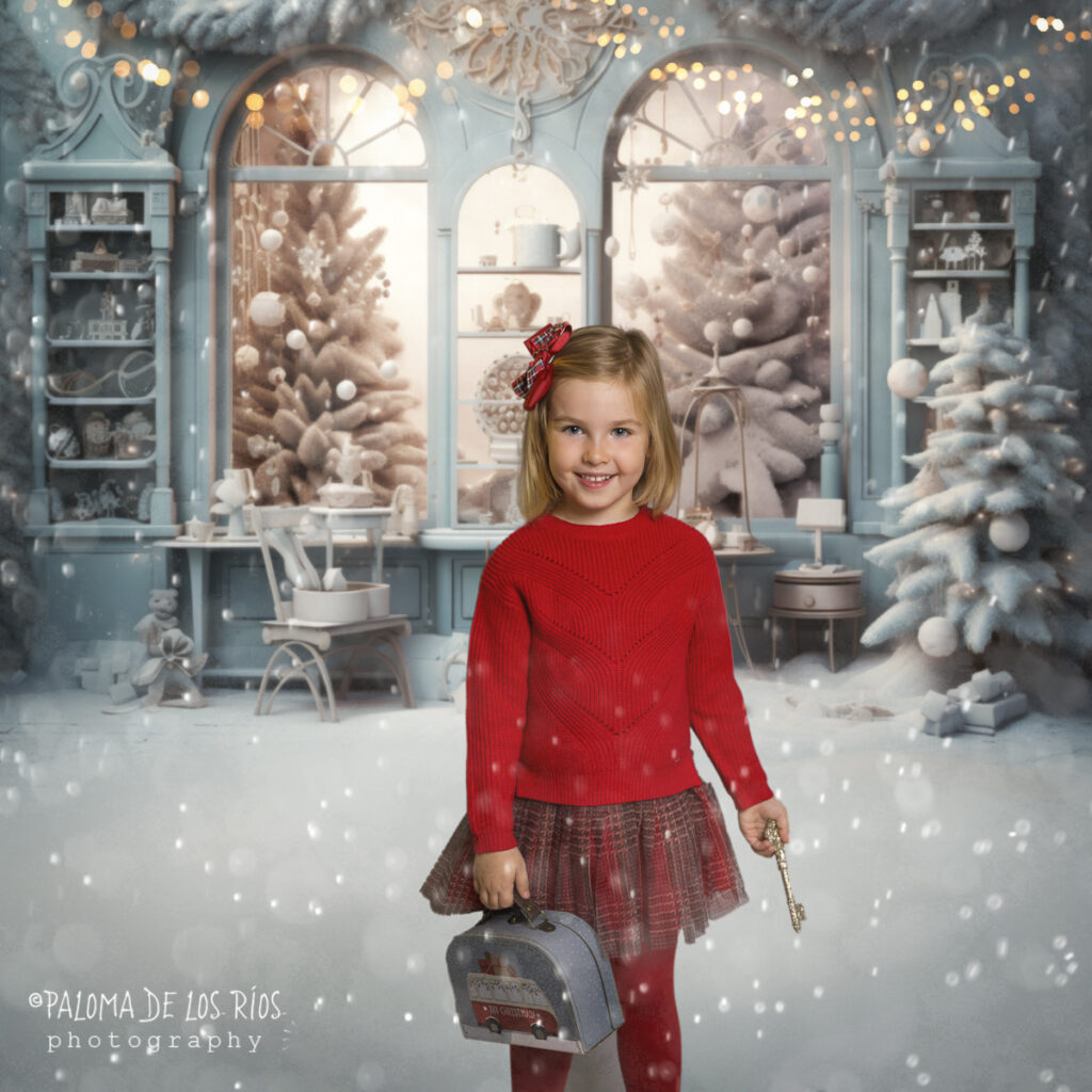 El segundo escenario es una plantilla de Photoshop que contiene una imagen de una fachada de un escaparate con una preciosa ambientación navideña. Este fondo sólo se podrá elegir junto al primer escenario, por lo que elegir este escenario sólo, no será posible. Haremos algunas fotos con un fondo gris y yo realizaré el montaje después.